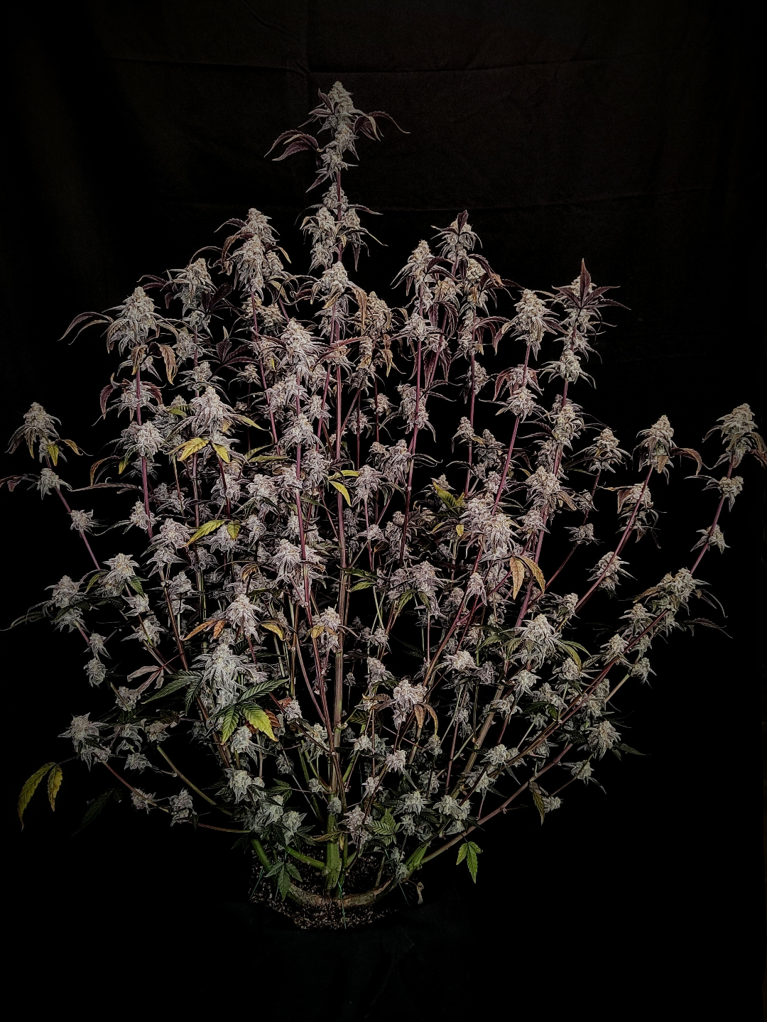 In the garden, she easily thrived on basic organic dry amendments, and demanded extra Calcium support to fill the needs of stretch as her multiple colas climbed to a beastly 47 inches. She became thirstier than average as she demanded 1.5 gallons of water a day in mid flower at moderate temps. During this time her trichome coverage multiplies exponentially day after day, leaving her caked in a silvery white blanket that extends outward to the leaves. Her aroma becomes increasingly difficult to contain week after week, and as harvest drew nearer her extreme gassiness overwhelmed the exhaust filter.